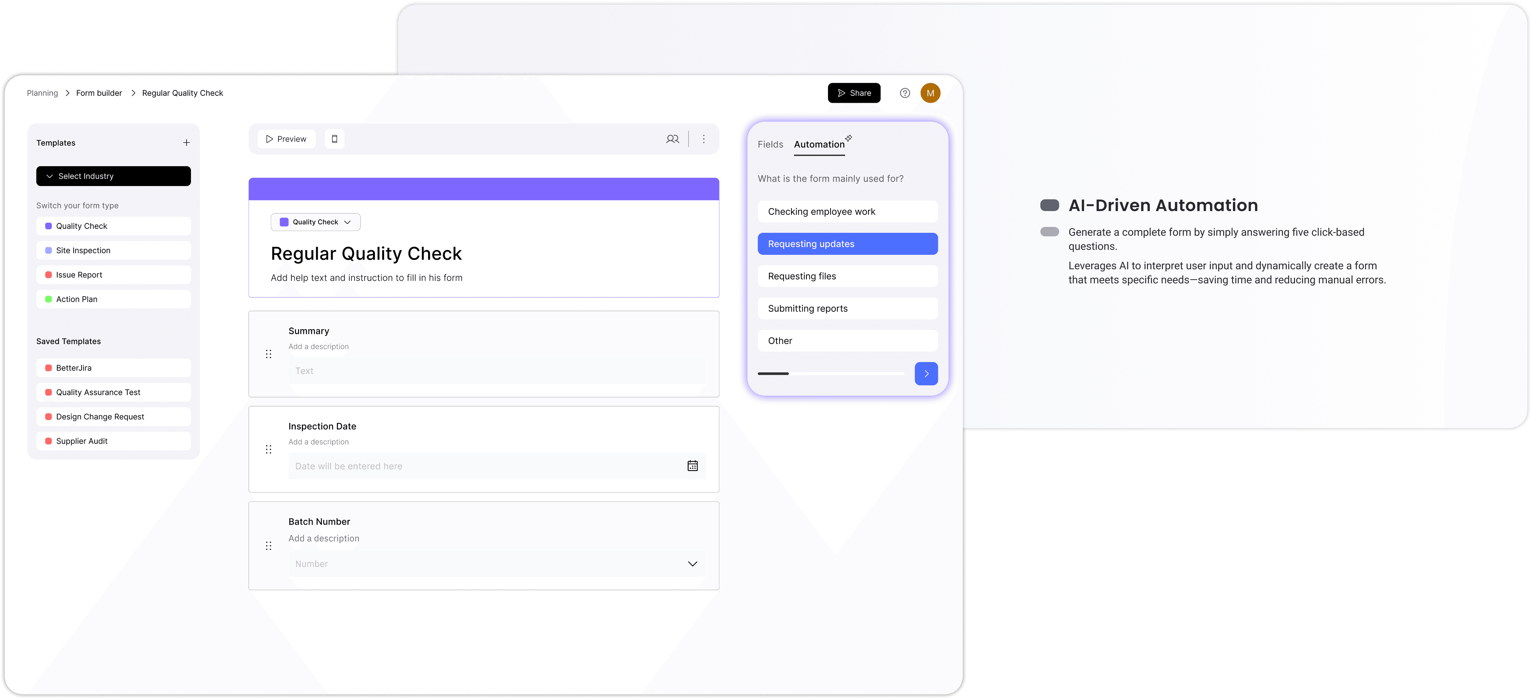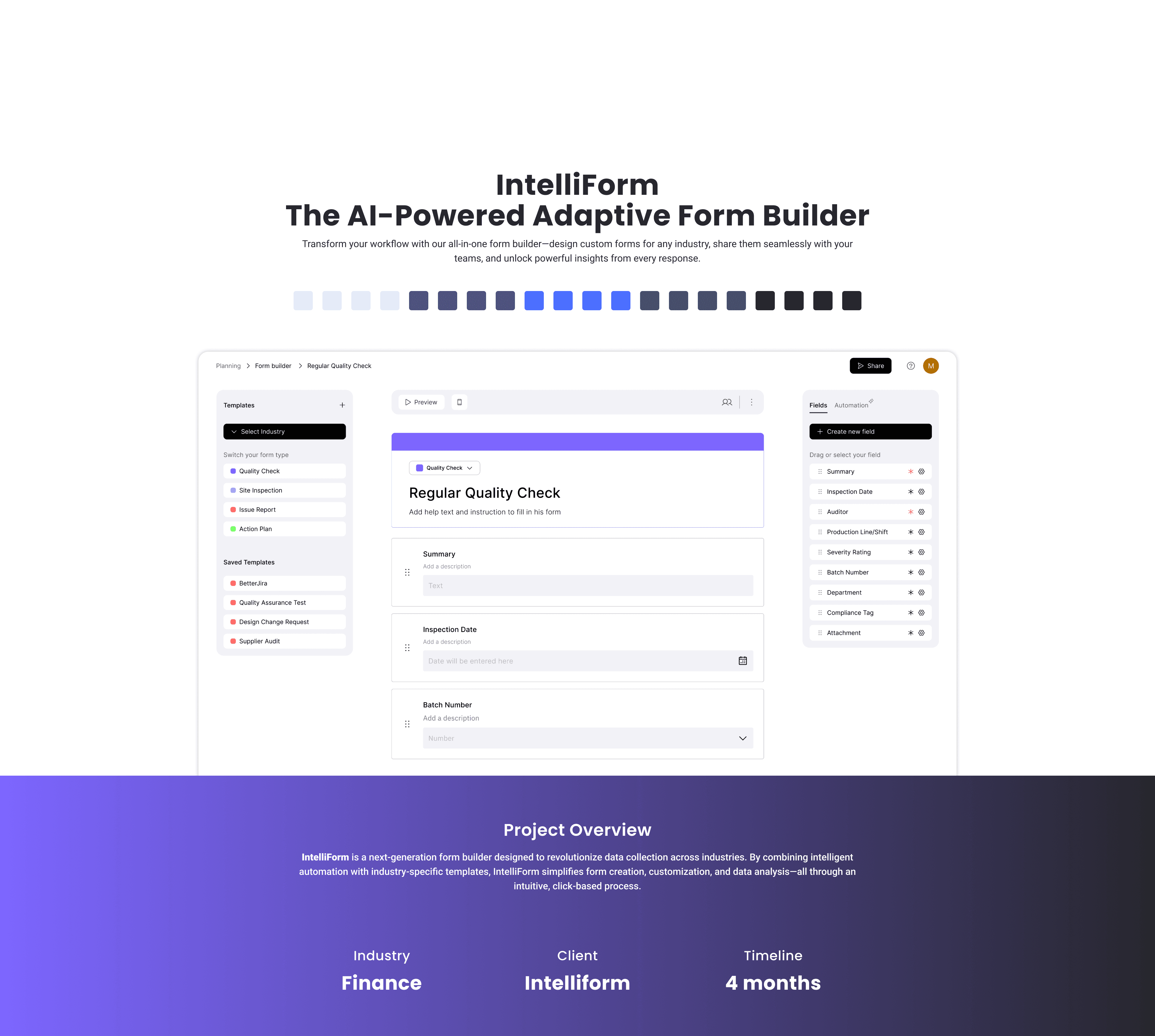 A complete redesign built for the modern workflow. IntelliForm is an AI-powered form builder designed for both web and mobile, offering smarter field controls, automation, and industry-ready templates. From generating forms in just five clicks to analyzing responses and integrating with tools like Slack or Notion, this solution reimagines how teams create, manage, and track forms across industries.